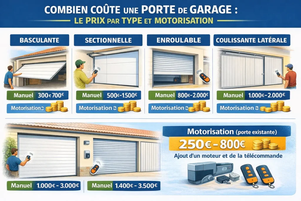 | Porte basculante | 300 € – 1 200 € | 600 € – 1 600 € | Coût faible / simplicité |