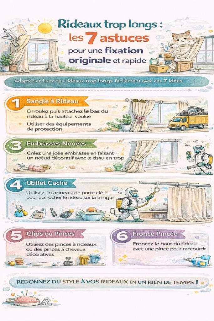Vous pensez à l’accessoire facile, sous la main, oublié parfois dans un tiroir. Un ruban, une pince à rideau, un chouchou recyclé de la salle de bain, chaque objet trouve sa place dans cette lutte contre la longueur excessive. Un nœud bien fait, une torsade nonchalante, le tissu se dompte. Vous détournez, improvisez, la fenêtre devient le théâtre de vos trouvailles. Par contre, ne négligez jamais l’efficacité, seule juge de la réussite.