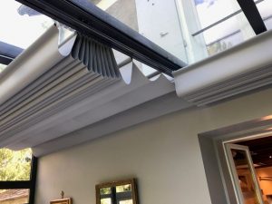 Pour ce projet, IDESIGN a préconisé des profils latéraux de guidage munis d’une toile solaire type Screen et d’un système de plis rigides masqués dans un fourreau.